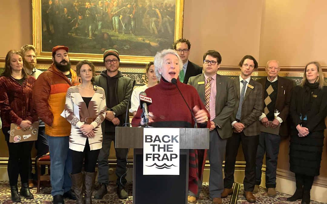 Photo: Sen. Alison Clarkson in the Cedar Creek Room at the State House in Montpelier, Friday, February 23, urging fellow legislators to BACK THE FRAP by supporting the Flood Recovery Assistance Program (FRAP) provisions in the Flood Omnibus Bill that is being proposed...