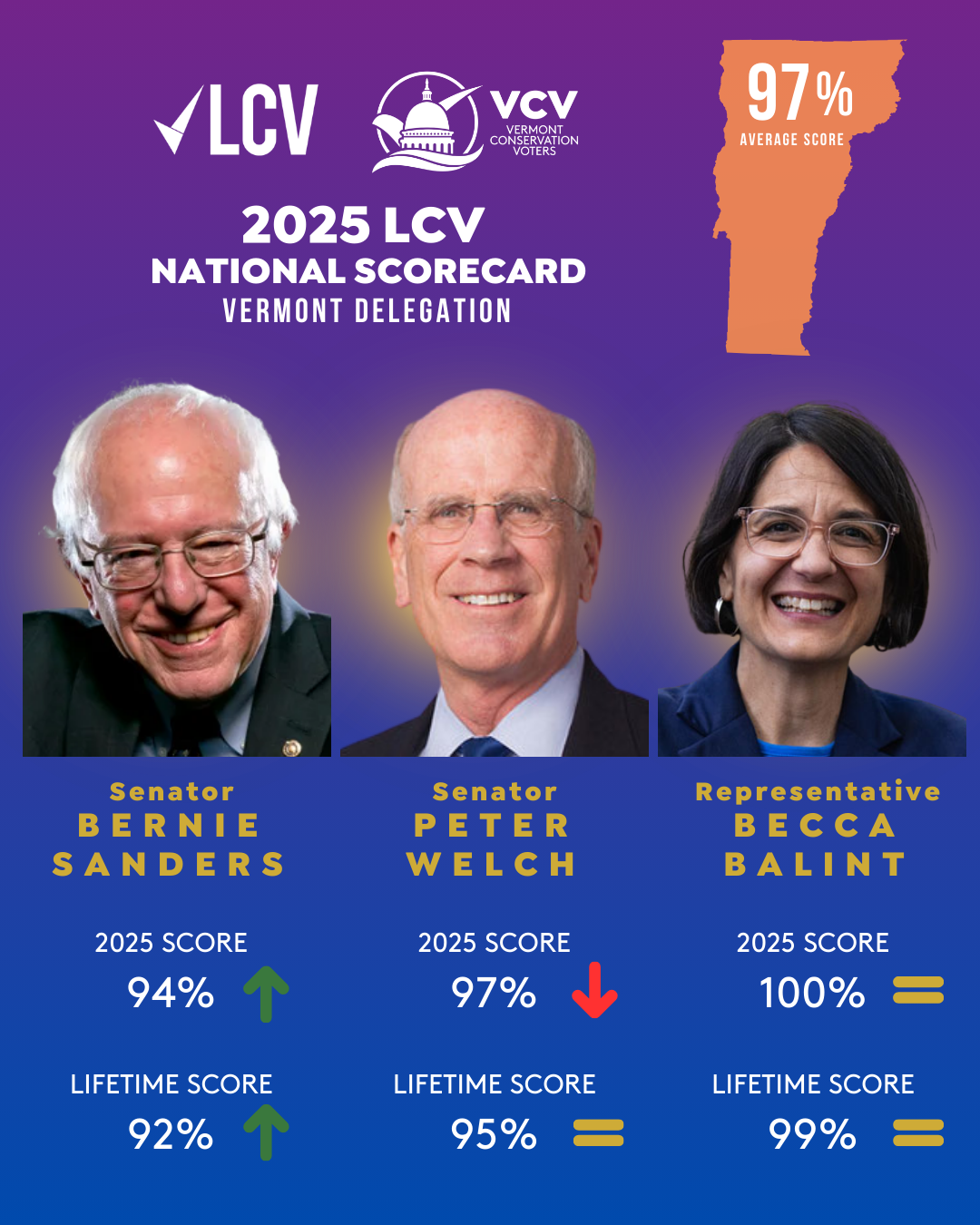 Today, Vermont Conservation Voters (VCV) released the Vermont Congressional delegation’s scores for the League of Conservation Voters’ 2025 National Environmental Scorecard, which highlights our state’s leaders’ work to protect our environment and democracy. Since 1970, LCV’s Scorecard has been the primary tool for evaluating the environmental records of members of Congress. It is available for download at: scorecard.lcv.org